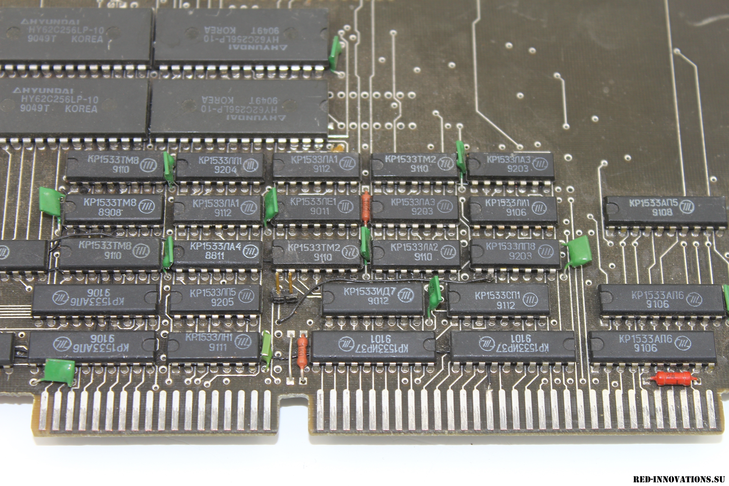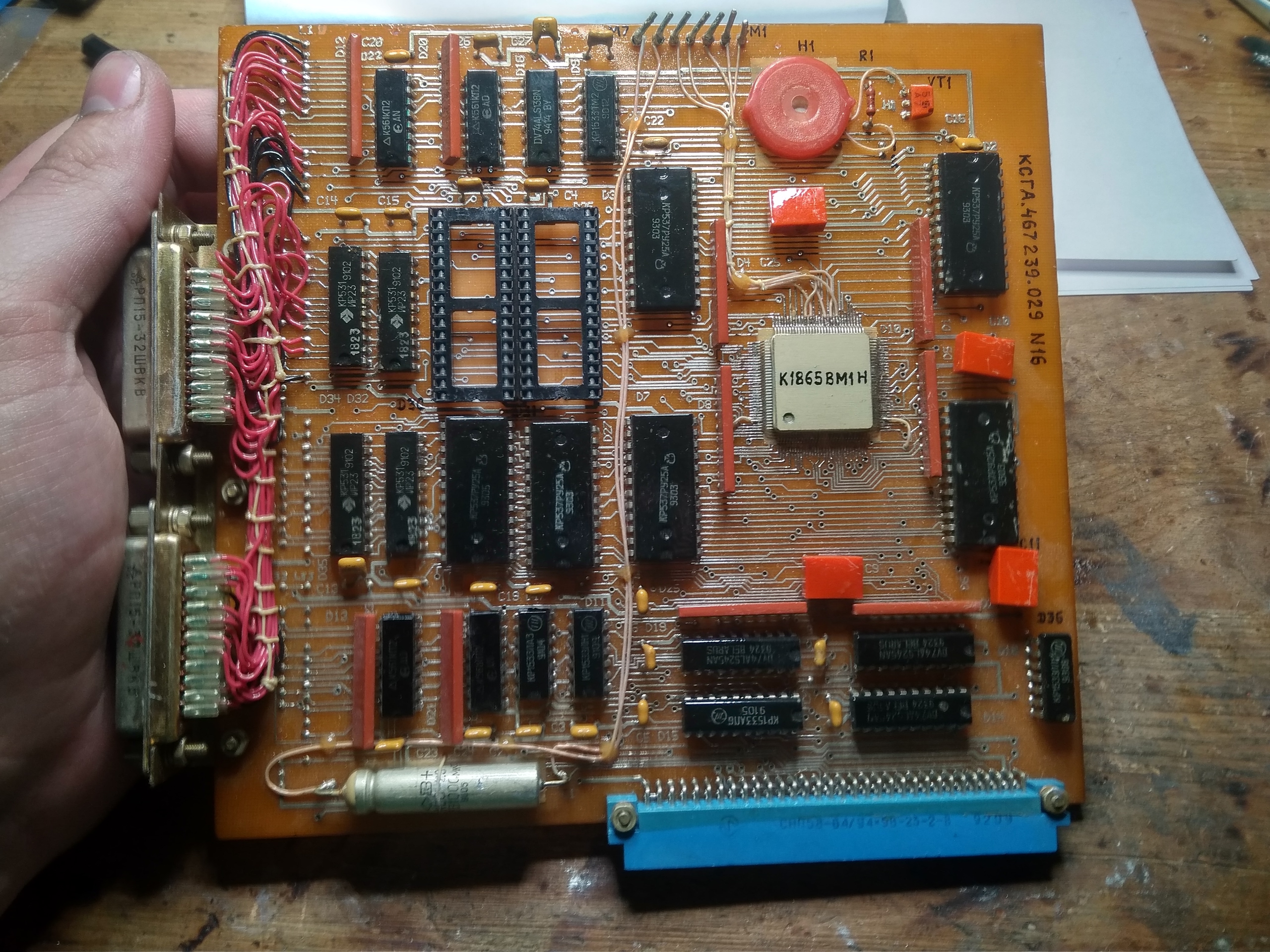 В начале 1990-ых годов на минском НПО "Интеграл" велись работы по созданию 16- и 32-разрядных процессоров архитектуры Forth (НИОКР "Дофин-16", "Дофин-32"). Рабочие образцы 16-разрядного процессора получили обозначение К1865ВМ1Н, размещались в отечественном SMD корпусе типа 4227.124-1. На данной плате предположительно смонтирован именно этот процессор или его 32-битный вариант (меньшая из двух БИС), а также его чипсет. Кроме того на плате имеются микросхемы статического ОЗУ К537РУ10Б и HY62C256-10. ПЗУ отсутствует - вероятно, прошивка должна загружаться после запуска ЭВМ и корректироваться разработчиками по ходу тестирования. Сама плата предназначена для установки на шину ISA PC-совместимого компьютера. Выпущена в 1993 году. Разыскивается любая информация о данной плате!